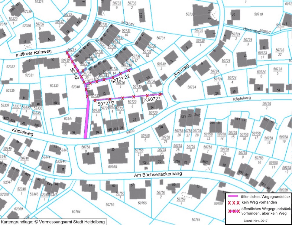 Zudem geht von diesem Verbindungsweg ein weiteres schmales Wegegrundstück ab (50727/2 und 50727). Dieses führt hinter den Gärten der Häuser Köpfelweg 30 bis 24 entlang (evtl. ein ehemaliger verdolter Bachlauf). Es trifft auf den Rainweg und wenig versetzt auf den Hasenweg – eine attraktive Alternative zu den ohnehin zu schmalen Gehwegstreifen des viel befahrenen Köpfelwegs.