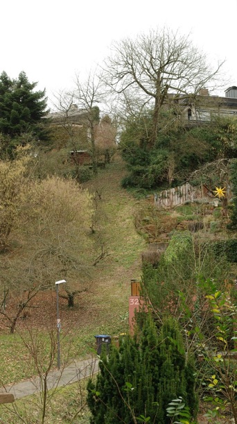 Die Realisierung der Wege auf den beiden vorhandenen Wegegrundstücken würde eine für den Fußverkehr sehr angenehme Anbindung ans Tal schaffen.