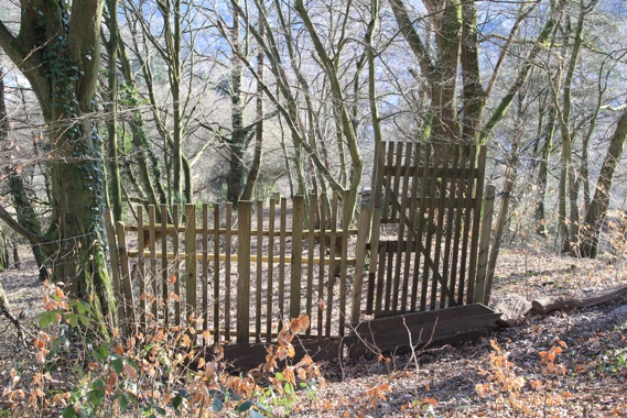 Man könnte nun ein Stück weit den gepflegten, in Serpentinen verlaufenden, privaten Petershof-Weg nehmen, der nach dem Haus Peterstaler Straße Nr.199 abzweigt. Doch das öffentliche Wegegrundstück oberhalb des Porphyrsteinbruchs ist im Waldwuchs untergegangen und nicht mehr begehbar. Versucht man nun den Weg vom andern Ende von oben her –vom Waldrand aus– zu begehen, steht man auch dort vor einem Tor. Das Schild „Durchgang verboten“ wurde von den Anrainern auf unseren Hinweis hin entfernt. Dem Wanderer nutzt das aber nichts, da der Weg oberhalb des Porphyrsteinbruchs ja nicht vorhanden ist.