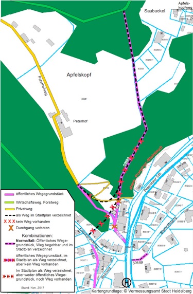 – Zur Herstellung der Begehbarkeit des Weges von der Peterstaler Straße aus sehen wir zwei Optionen: Verwendet man die öffentlichen Wegegrundstücke, würde die Privatsphäre der Häuser Peterstaler Straße Nr.195 bis 199 empfindlich gestört; zudem müssten zwei Schuppen abgerissen werden. Stattdessen würden wir die zweite Option vorziehen: Die Verlegung des ersten Wegeabschnitts, wofür ein öffentliches Wegerecht für den unteren Teil des privaten „Peterhof-Wegs“ erwirkt werden müsste.
